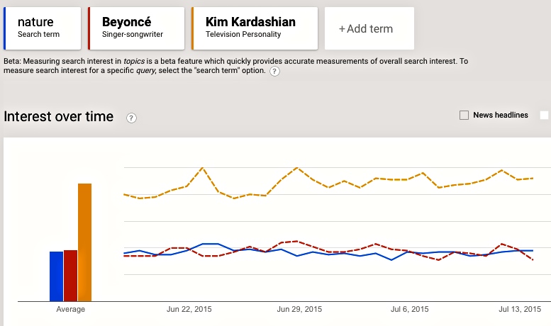 Trend watchers announced that Nature may finally have begun a long hoped for comeback. In a development that caught the world off guard, last week Nature surged past Beyoncé in the well respected Google Trends ratings. S/he now has sights set on surpassing Kim Kardashian in public popularity. That will be a stiff challenge. Nature currently receives a respectable 823,000 web searches a month. But for each search for Nature, there are nearly 17 for Ms Kardashian, who receives 13,600,000 searches a month. Continue reading Nature smacks down Beyoncé. Will Kim be next?